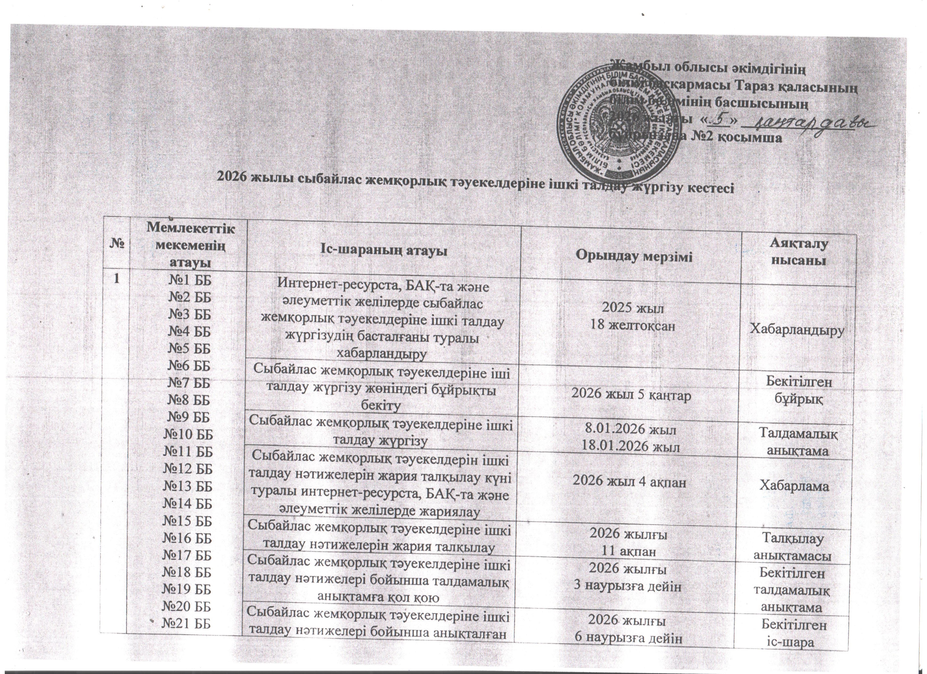 05 январь 2026 0 1 2 3 4 5 Сыбайлас жемқорлық тәуекелдеріне ішкі талдау жүргізу жөніндегі жұмыс жоспары